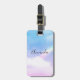 En bagagetagg med en mjuk och underbar bakgrundsbild. Pastellkritor och rosa moln med magisk regnbåge.