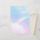 Stationär papper med en mjuk och vacker bakgrundsbild. Pastellkritor och rosa moln med magisk regnbåge.