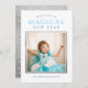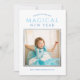 Önska din familj och dina vänner ett "magiskt nytt år" med den här moderna visuella designen. Innehåller ett fyrkantigt foto med en silver färgad gräns och anpassningsbar himlar och medelblå text som kan vara helt personlig och anpassad för att matcha ditt färg-schema. På baksidan av kortet finns en baksida av silver-faux-folie med en gräns av vita konfektpunkter. Fotografi © Storytree Studios, Stanford, CA
