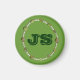Cirkel i bårarbete. Tre vita pärlor är placerade mellan stenar av varierande storlek och nyanser av grönt, på en medelstor grönt. Anpassa med initialerna.
