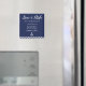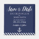 Magneter i Nautiskt bröllop spara datum med marint blått och vitt rand, vit fästpunkt och utbytbar vit text tryckt på marinblå bakgrund