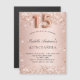 En magnet-inbjudan till en elegant Quinceañera, 15:e födelsedagsfesten. En övertoningsbakgrund för ro guld. Dekorerad med damm från ro guld faux glitter. Anpassa och lägg till information om namn och party. Namn är skrivet med ett handskript i stil. Nummer 15 skrivs med ett stil-teckensnitt med ballong. Både en inbjudan och en Spara datumpåminnelse till dina gäster!