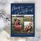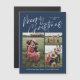 Blått God jul Calligraphy Photo Magnetic Card har ett modernt kalligrafiskt skript på framsidan, tillsammans med tre foton, och en julklapp på baksidan.