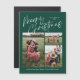 Grönt God jul Calligraphy Photo Magnetic Card har ett modernt kalligrapskript på framsidan, tillsammans med tre foton, och en julklapp på baksidan.
