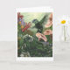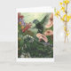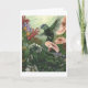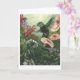Vacker målning av Wendy Carter av en hummingbird i trädgården med nymhs gömmande i blommorna.