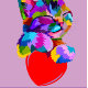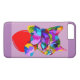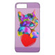 Ett vibrerande telefonfodral med en färgstark, stiliserad illustration av en katt med ett lekfullt uttryck. Katten, som återges i ett spektrum av ljusa nyanser, verkar kapa mot ett stort rött hjärta. Bakgrunden är en mjuk lavender som förbättrar katten.