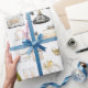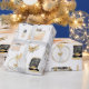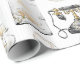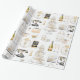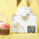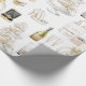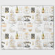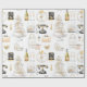 Randigt inpackningspapper med magnolior, svarta, gyllene och krämfärgade bröllopspresenter för bruden.