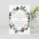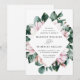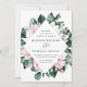 Bröllopbjudanden för blommigt i elegant med dina bröllop-uppgifter omgivna av ett geometriskt ram av rosa magnolia blommor och grönt eucalyptus löv. Baksidan av de gigantiska bröllopsinbjudningarna har en solid eukalyptus grönt bakgrund. Designad för samordning med vår insamling av Magnolia & Eucalyptus bröllop.