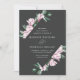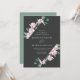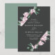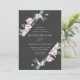 Bröllopbjudanden för blommigt i elegant med dina bröllop-uppgifter omgivna av ett geometriskt ram av rosa magnolia blommor och grönt eucalyptus löv mot en träkolbakgrund. Baksidan av de gigantiska bröllopsinbjudningarna har en solid eukalyptus grönt bakgrund. Designad för samordning med vår insamling av Magnolia & Eucalyptus bröllop.