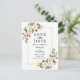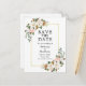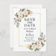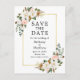 Elegant Watercolor Rosa ros och White Magnolias Save Date Bröllop annons Postcard innehåller botaniskt grey och eukalyptus löv på guld ram.
