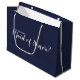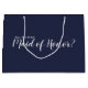 "Kommer du att vara min Maid of honor?" Modern skribentblått Maid of honor Frieri Gift Bag med texten "Kommer du att vara min Maid of honor?" i det vita, moderna skriptteckensnittet stil på marin blå bakgrund.