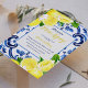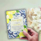 Full av medelhavs charm, kommer Mammas Main Sqeeze Blue Tile Lemon Citrus Fruit Baby Shower-inbjudan föra dina gäster till en soldränkt siciliansk sommar. Med en livfull citron i mitten mot en bakgrund av slående blå och vita italienska kakelplattor, fångar denna design essensen av nytt liv och glädjen över att välkomna en liten en.