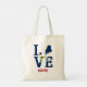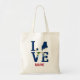 Maine kärlek. Teckensnittet i ljusröd versaler. Ord kärlek fylls med statlig flagga och brev O i kärlek formas i Maine-statens silhuett.