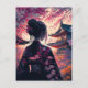 Computer generiertes Design einer Geisha in einem Kirschblüten Zauber. Abbildung einer Frau mit einer hübschen Hochsteckfrisur und Blüten im Haar welche einen Kimono trägt. Japanisches Design im AI - Midjourney Style. Im Hintergrund Japanische Gebäude.