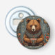 Majestätisk björn som sitter lugnt, prydd med en vacker detaljerad halskedja. Den håller en skål fylld med röda bär, omgiven av blomsterdekorationer och olika symboler i bakgrunden. Konsten kombinerar element av naturen med mystiska symboler, vilket skapar en fängslande och lugn atmosfär.