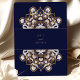 Denna exklusiva bröllopsinbjudan fångar essensen av elegans med sin fantastiska kombination av midnattsblått och guld. Kortet visar ett symmetriskt blommönster som påminner om traditionell islamisk konst, med vita och gyllene blommor sammanflätade med mörkblå accenter och geometriska mönster. Det intrikata guldfyllda rullverket och de blomsterliknande motiven är satta mot en djupblå bakgrund och utstrålar en känsla av lyx och tidlös grace. Designen hämtar inspiration från Art Nouveau-perioden, känd för sina stiliserade naturliga former och böjda linjer, samtidigt som den också inkorporerar element som hyllar klassisk islamisk konstnärskap. Denna inbjudan är perfekt för par som vill göra ett statement med