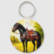 En slående svart häst prydd med en färgrik sadel, stående graciöst mot en livfull landsbygdskuliss med blommande blommor och varmt solljus, frammanande en känsla av frihet och lugn.