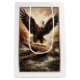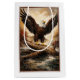 A powerful painterly depiction of a bald eagle standing atop a rugged driftwood log, wings fully outstretched in a commanding pose. Rich earthy tones blend with dynamic brushstrokes, capturing motion in the splashing water below and the glowing sky behind. The artwork conveys strength, freedom, and resilience, with detailed feather textures and dramatic contrast enhancing its bold, expressive style.