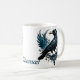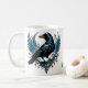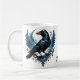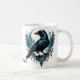 Majestisk svart raven sitta på ett ornat, stiliserat gren. Kombinationen av blommornas blåa och vita coola skapar en harmonisk kontrast till de varma guld-tonerna på näbben. På det hela taget förmedlar konstruktionen en känsla av styrka, elegans och mysterium