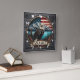 En detaljerad illustration av en örn som stolt står med berg, vatten, och en amerikansk flagga i bakgrunden, omgiven av naturens inslag.