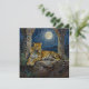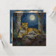 A leopard themed blank notecard. On the front is an illustration of a majestic leopard with fur like molten gold, laying on a cliff ledge bathed in ethereal moonlight. Intricate carvings adorn crumbling stone pillars, and bioluminescent flora casts a soft, otherworldly glow. The scene is rendered in a rich, textural oil painting style with thick strokes.