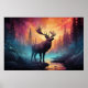 Ett vildlevande verk, med levande surrealistiskt färg, av en älg (eller älg eller hybrid) som står i huvudsak i 3/4-profil på en utgröning av sten som sträcker sig in i bäck vid grund på en liten mistkanyon. Hans huvud hålls uppe, och bakom honom ligger en snabbt tillnärmande vildeld.