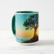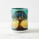 A magnificent, sprawling tree stands as a brilliant symbol of natural harmony and technological innovation. Nestled within its lush canopy are modern solar panels and wind turbines, seamlessly integrating renewable energy with organic growth. At the base of its massive, deeply rooted trunk lies a peaceful village, perfectly coexisting with the environment. Set against a breathtaking sunset over tranquil waters, this scene represents an ideal future where human habitation, clean power generation, and the majestic beauty of nature thrive together in a perfectly balanced ecosystem.