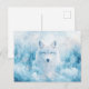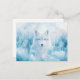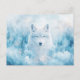 This ethereal postcard features a noble white wolf with captivating, crystalline blue eyes staring forward with a calm and powerful presence. The artwork is rendered in a soft, luminous style, where the wolf's fluffy fur blends seamlessly into a dreamlike landscape of frost-covered pine trees and swirling blue mist. Shimmering light particles and soft bokeh effects dance through the air, creating a magical atmosphere of quiet winter wonder. The cool color palette of icy blue, cerulean, and crisp white evokes a sense of serene wilderness. This postcard is a perfect choice for sending a soulful message, a unique winter greeting, or as a striking decorative keepsake for nature and fantasy lovers.