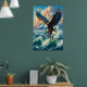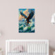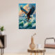 Ett mäktigt örn sjunker med utdragna taloner för att fånga en fisk från vapenskölden av en våg i en dynamisk visning av naturdrama. Oceanernas turbulenta vatten avspeglar sol:s gyllene nav, medan fåglarna fokuserade på blaze och fiskarnas desperata språng symboliserar djurets liv- och dödskamp.