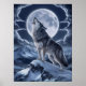 En ensam varg står stolt över ett berg täckt av snö och bortser från ett stort vinterlandskap.