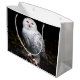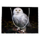 Fotografi av porträtt av stora snövrak uggla som står på gren.