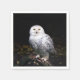 Fotografi av porträtt av stora snövrak uggla som står på gren.