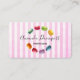 Chic visitkortsmall med en finare-vattenfärgsdesign av söta och delikata makaroner av Fransk i cirkulär form. Makaronerna är målade i många fina färg som rosa, blått, kalkgrönt, solig gult, rött, lila osv. Ställ in på en nödlidande rosa stripe-bakgrund.