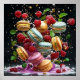 En kraftig och dynamisk scen av makaroner i en explosion av färg. De här Franskarna har kom i olika skuggor, t.ex. mynta gröntar, gyllene gulter, mjuk rosa och lavender, och är konstgjort ordnade så att de visas som om de flyter eller flyger genom luft. Omgivande makaroner är färska röda hallon och utspridda löv av mynta, vilket förbättrar färskheten hos sammansättningen. En stänk i färglös vätska, som sannolikt representerar kräm eller sås, är artificiellt stänkt och skapar en livlig och lekfull atmosfär. Bakgrunden är mörk, som hjälper färgen av makaroner och bär att dyka upp på ett dynamiskt sätt, och som skapar hela scenen att känna sig energisk och som kvävs i munnen. Användan av brister i guld tillför lite elegans till denna beundransvärda visning.