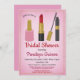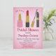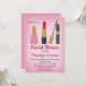 En feminin giftig makeup inbjudningskort för möhippan med läppstift, nagel polsk och mascara med rosa bakgrund och faux guld glitter accents.