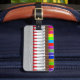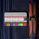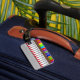 Avbilda av målar borstar i en läderpåse som målar randar av färg