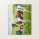 Den original- konstdesignen av tricolored målar hästen och henne fölet av konstnären Carolyn McFann av studion för två spinnakatter som skrivs ut på ett kvalitets- pussel för hästälskare.