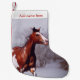 Fotografera av ett härligt målar hästen som är snabbt växande i snön, med snö-täckte träd i bakgrunden som skrivs ut på en julstrumpa. - Ta bort texten och tillfoga därefter din egna text.