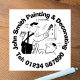 Dekoratorns gummi frimärke. Office frimärke för en dekorator. Roligtens tecknad- och dekorationsillustration visar en man med färgpensel uppåt en stege. Anpassa den efter ditt val av företag, namn och kontaktnummer. Bläck frimärke för en dekorationsverksamhet.