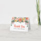 En frodig målad blomsterkrans i korall, persika och gula blommor kaskaderar över toppen av detta ljusa och glada bröllop tack-kort. Paret monogramnamn visas i fet stil under arrangemanget, vilket skapar en glad souvenir som gästerna kommer att värdesätta. Anpassa namnen och lägg till ett hjärtligt meddelande på insidan för att fullborda denna vackra svit.