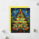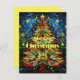 Kyrkfönster-julgran i rött, blått, grönt, orange och gult. Blå bakgrund med gula stjärnor och ett grönt barrträd på vardera sidan om den mittersta granen. "God Jul" i gult tryck och kortet är enfärgat gult på baksidan. Unikt julkort.