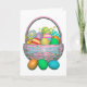 Skämt kort med min bild av färgstarka, färgade, färgade Påskägg i söt basket med en banderoll som säger "Glad påsk". Gå in.