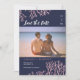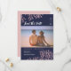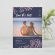 En elegant strandbröllopsinbjudan med glänsande rosa koraller på en midnattsblå bakgrund, kompletterad med modern kalligrafi. Skicka mig ett meddelande om du vill ha designen i ett annat färgschema. Originaldesign och illustrationer av Kitty Pie Prints.