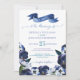 En inbjudan till blommigt med illustrerade lila-paneler och blått band. Inspirerad av trädgårdsbröllop.