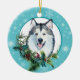 På framsidan av denna Helgdag är ett vackert porträtt av en Malamute-hund som pissar ut från en holly och en evig grön bough. Röda bär och gräs-koner dekorerar huggen och gräs sprickor.Bilden placeras på en vit cirkel inramad av en reflexblå snöflinga mönster. Baksidan av dekorationen har samma bakgrund och cirkel med anpassningsbarnas text i blått på vit bakgrund.