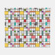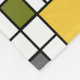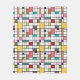 Denna medelmåttiga filt har en modern utformning av ett rutnät av svart linjer med kvadrater och rektanglar i färg på en vit fält.