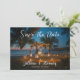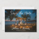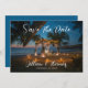 Spara datum meddelande-kort för destinationsbacheminnet. Konstruktionen har en ljusbelyst kabana på en vit sandstrand med handflatan träd och hav i bakgrunden. I texten på framsidan finns: Spara datum, Namn och Bröllop. Texten på den omvända sidan innehåller: Bröllop Location Namn, Details and Formal Investigation To Följ - on a tropical blue bakgrund. Om du vill anpassa dig infogar du bara din textinformation i vår enkla mall som ersätter exemplet. Finns i tryck eller digital nedladdning.