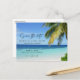 Ett modernt vykort i bröllop spara datum i en tropisk strandfotografi med vit sand, turkos vatten och uppsving handflatan träd. Anpassa med din bröllop-information. Lägg till returadress, datum och anpassningsbar för bröllop på baksidan av vykortet.