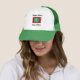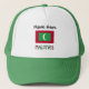 Den maldiviska flaggan i rött och grönt, med ordet MALDIVES nedan, i flaggans färger. I utrymmet ovan kan du lägga till ditt namn för en anpassad look. Eller, placera någon annans namn i fältet för en personlig truckerhatt-gåva.