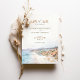 Det här vackra spara-the-date-kortet fångar Malibu, Kalifornien, elegans, med en fantastisk vattenfärgbild som visar högt handflatan träd mot en bakgrund av rullande backe och blå himmel. De mjuka vattenfärgtonerna havsblått, sandbeige och lush-grönt framkallar den avslappnade vibben från ett firande vid sidan, perfekt för ett destinationsbröllop eller ett kusttemat evenemang. Elegantens typografi i jordens nyanser kompletterar vattenfärgsscenen och anger tonen för en romantisk bröllopsdag som är genomblöt av sol. Perfekt för par som planerar ett bröllop i Malibu eller någon annanstans längs Kalifornien kusten, är detta kort en blandning av naturskönhet och konstnärligt stil.